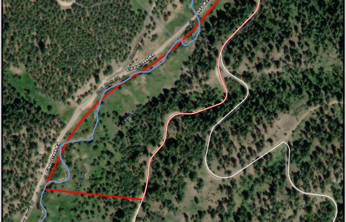 The lush green canopy of trees stretches as far as the eye can see, with a well-maintained dirt road winding through the landscape, providing easy access to various parts of the property. The forested area is ideal for hiking, wildlife observation, and enjoying the tranquility of the great outdoors. Additionally, the property offers easy access to Forest Service Land, expanding your exploration and recreational opportunities.