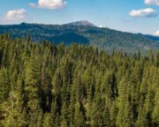 The land is richly timbered with a healthy mix of mature pine and fir, interspersed with open meadows and natural clearings that create ideal building sites framed by sweeping mountain views. Approximately 420 feet of elevation change adds character and dimension to the property, with gently rolling terrain, elevated benches, and scenic vantage points overlooking the surrounding forested valley.